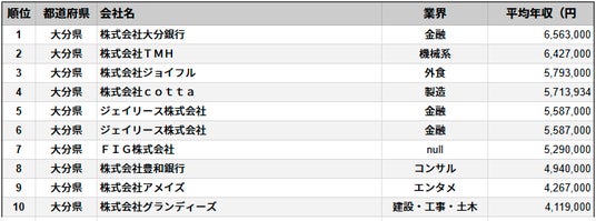 株式会社SalesNow(本社:東京都渋谷区、代表取締役:村岡功規、以下「当社」)は、国内540万社の企業情報を完全網羅した日本最大級のデータベース「SalesNow DB」より、上場企業を対象に大分県に本社を置く企業の平均年収データを集計・分析し、「平均年収ランキング」として公開いたしました。