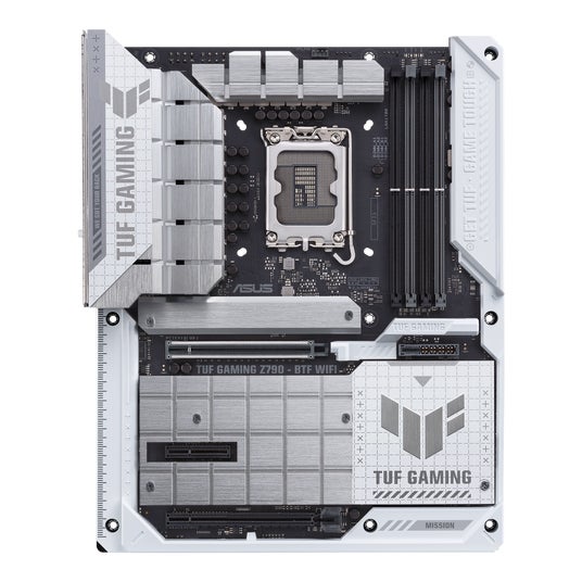 白を基調としたTUF GAMING Z790-BTF WIFIは、グラフィックカードハイパワースロットを備え、すっきりとしたケーブルマネジメントとミニマルな外見を実現しています。
