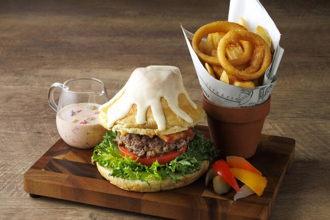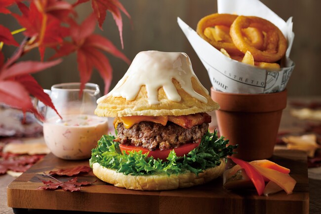 富士山に見立てたユニークなオリジナルのブリオッシュバンズに、噛み応え抜群で肉々しくジューシーな「山梨県産鹿肉」100%パティと「甲州富士桜ポーク」ベーコン、山梨県産トマトなどを贅沢に挟んだバーガー。古来より甲斐国(現・山梨県)で栽培されていた8つの果実「甲州八珍果(桃、りんご、ぶどう、梨、柿、栗、ザクロ、銀杏)」をシラチャーソース入りの少しスパイシーなオーロラソースにゴロっと混ぜ込んだ甘さと辛みが絶妙でフルーティなソースをお好みで。付け合わせには、バーガーとも相性のいいフレンチフライやオニオンリングのほか、甲州ワインビネガーで漬け込んだオリジナルピクルスをご用意。シェフのユニークで遊び心ある富士山バーガーとソースで、秋の情景を感じながらお召し上がりください。