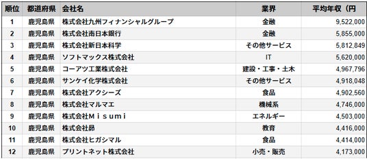 株式会社SalesNow(本社:東京都渋谷区、代表取締役:村岡功規、以下「当社」)は、国内540万社の企業情報を完全網羅した日本最大級のデータベース「SalesNow DB」より、上場企業を対象に鹿児島県に本社を置く企業の平均年収データを集計・分析し、「平均年収ランキング」として公開いたしました。