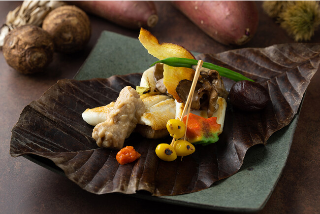 八百姫ひらめのソテーとアオリイカ、上庄さといもソース -福井県伝統の薬味 山うに、秋の味覚を添えて-