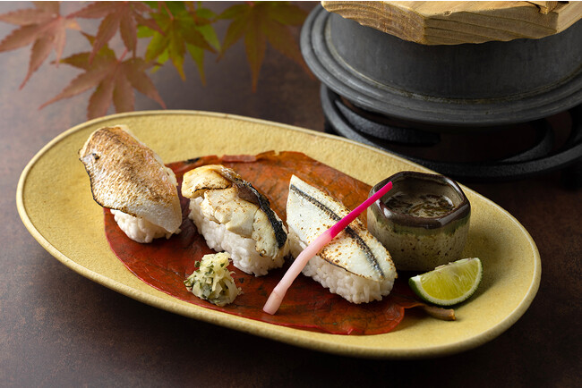 鉄板で仕上げる焼き寿し -小鯛ささ漬、焼き鯖、さより-