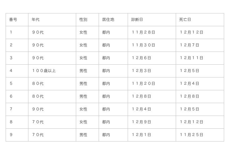 2020-12-16 東京都 新型コロナウイルスに関連した患者の死亡について Tweet ~新型コロナウイルスに関する東京都からのお知らせ~ 都内で新型コロナウイルスに感染した方が死亡されましたのでお知らせします。 お亡くなりになった方のご冥福をお祈り申し上げます。 [表: https://prtimes.jp/data/corp/52467/table/1190_1.jpg ] 企業プレスリリース詳細へ PR TIMESトップへ 公式ツイッター Follow @Straightpress 最新情報をTwitterで受け取ろう! 公式フェイスブックページ 最新情報をFacebookで受け取ろう! 前の記事 一覧へ戻る 次の記事