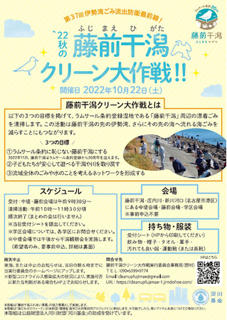 海と日本プロジェクトin愛知県実行委員会は、2022年10月22日(土)にラムサール条約登録湿地である「藤前干潟」周辺の漂着ごみを清掃して海洋ごみを減らすことを目的とする【第37回 秋の藤前干潟クリーン大作戦!!】を昨年に引き続き開催します。この取組みは、日本財団が推進する海洋ごみ対策プロジェクト「海と日本プロジェクト・CHANGE FOR THE BLUE」の一環で開催するものです。