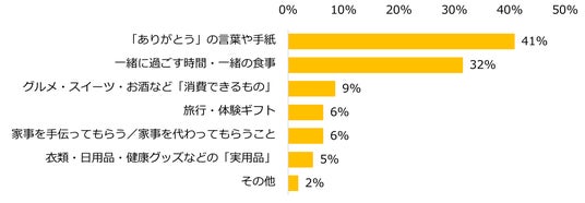 「子どもがいる」と回答した方(599名)に母の日、父の日に欲しいプレゼントを伺うと、第1位は「“ありがとう”の言葉や手紙」(41%)で4年連続のトップとなりました。(※)