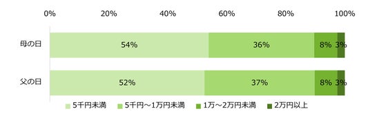 プレゼントにかける予算は、母の日・父の日ともに「5千円未満」が最多でした(母の日:54%、父の日:52%)。