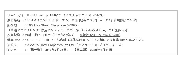株式会社パルコ(本部:東京都渋谷区、代表執行役社長:牧山 浩三、以下パルコ)の 100%子会社PARCO (Singapore) Pte Ltd (以下、パルコシンガポール社) は、シンガポール、タンジョン・パガーの商業施設「100 AM」(ハンドレッド・エム)にて展開している日系レストラン集積ゾーン「itadakimasu by PARCO」(イタダキマス バイ パルコ)を順次拡張してまいりました。2019年夏に一部店舗が先行開業しており、2020 年1 月 に完成を迎えました。