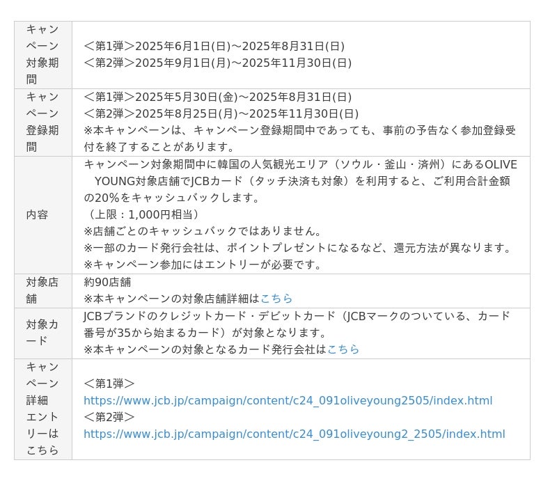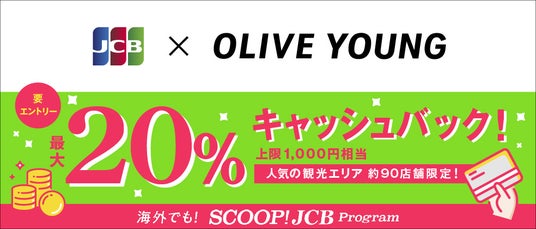 株式会社ジェーシービー(本社:東京都港区、代表取締役兼執行役員社長:二重 孝好、以下:JCB)は、2025年6月1日(日)から11月30日(日)まで、「韓国のオリーブヤングでJCBを利用すると20%キャッシュバック!」キャンペーンを実施します。JCBでは、「SCOOP! JCB Program」と題し、様々なキャンペーンや優待サービスをJCBブランド会員様にお届けしております。