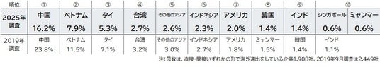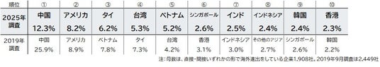 他方、販売拠点として最も重視する国・地域でも、「中国」が12.3%でトップ。次いで、「アメリカ」(8.2%)、「タイ」(6.2%)、「台湾」(5.3%)、「ベトナム」(5.2%)が続いた。同様に2019年調査と比較すると、「中国」の落ち込みが目立つ一方で、「台湾」の存在感が増しているほか、「インド」(2.5%)を重視する企業が増加していることがうかがえる。