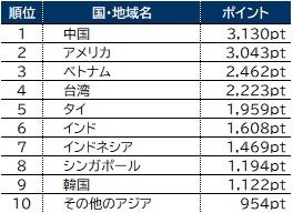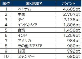 [2] 各国・地域のポイントは、調査の際に検討の可能性がある国・地域について1位~3位までの順位を付けた回答の結果に基づいて集計したものである。順位ごとにポイントを付与し、1位は5pt、2位は3pt、3位は1ptとして、合計ポイントを算出した