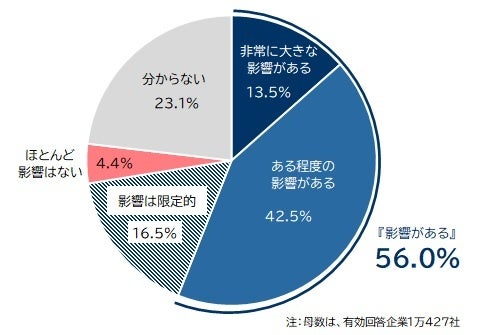 トランプ政権が主導する米国による各国に対する関税交渉の結果は、日本企業の海外進出にどのような影響があるか尋ねたところ、進出先の見直しや撤退の影響など「非常に大きな影響がある」と見込む企業は13.5%だった。コスト増や現地調達の見直しなど「ある程度の影響がある」は42.5%と多数を占めた。「影響は限定的」は16.5%だった。他方、「ほとんど影響はない」は4.4%にとどまり、多くの企業で海外進出に対して何かしらの影響が生じると認識していた。企業からは、「アメリカ市場への依存度が高い企業は戦略やサプライチェーン全体の見直しを迫られることになり、場合によっては撤退も視野に入れる必要がある」(建設、東京都)や「自国第一主義が今後も進むと考えられるので、安易な海外進出は出来ないと考える」(飲食料品・飼料製造、大阪府)といった声があがった。