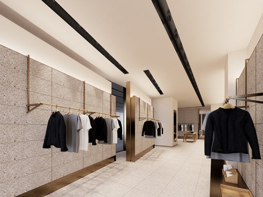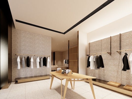 奥へと細長くつづく空間は、ファサードと同じ重量感を放つ砂岩の壁面パネルで構成しました。それとは対比的に什器やベンチはGoldwinのロゴを抽象化し、一枚の材から形作った〈ゴールドウイン・スツール〉を発展させた構成で軽やかに仕上げることで、独特の風合いを持つ空間を演出しています。