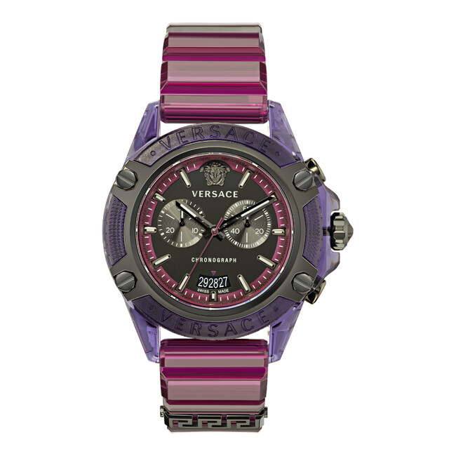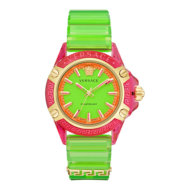 『ICON ACTIVE INDIGLO(アイコン アクティブ インディグロ)』は、4個のネジで留めたケージに収められた透明ポリカーボネート製ケースの腕時計コレクションです。ヴェルサーチェウォッチのベストセラーコレクションに、暗闇での視認性を高める「インディグロ(R)ナイトライト」を搭載。シースルーのストラップと大胆なカラーリングが、洗練された強い個性を放ちます。