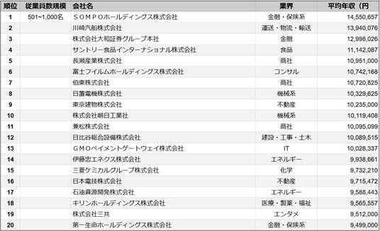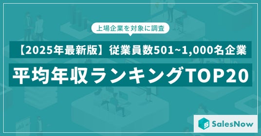 株式会社SalesNow(本社:東京都渋谷区、代表取締役:村岡功規、以下「当社」)は、国内540万社の企業情報を完全網羅した日本最大級のデータベース「SalesNow DB」より、上場企業を対象に「従業員数501~1,000名規模」に分類される企業の平均年収データを集計・分析し、「平均年収ランキングTOP20」として公開いたしました。