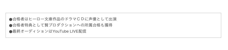 オーディション合格者は、ヒーロー文庫作品のドラマCDへの声優出演に加え、賢プロダクションとの所属合格が得られます。