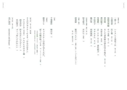 ・選者=石井隆広/伊藤亜紗/大内学/okadada/小津夜景/小原晩/岸波龍/指田珠子/芝健太郎/高城晶平/高野知宙/田村友里絵/中澤めぐみ/中村江梨花/難波優輝/林宏司/福田節郎/塀/星真一/前島亜美/松村幹彦/松本麻子/森岡葉子/山本莉会/吉田靖直