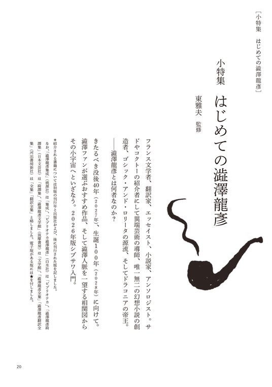 アクスタが密かなブーム。来年(2027年)没後40年、再来年(2028年)には生誕100年を迎える唯一無二の作家・澁澤龍彦の小特集「はじめての澁澤龍彦」をお届けします。監修はアンソロジスト・文芸評論家の東雅夫さん。東さんによる極上の澁澤案内「『はじめての澁澤龍彦』の方へ」&「関連人脈図」、さらに「私の好きな澁澤龍彦」には市川春子さん(漫画家)、荻堂顕さん(作家)、クラフト・エヴィング商會(作家・装幀家)、山尾悠子さん(作家)が登場。多種多様の澁澤愛に浸ってください。