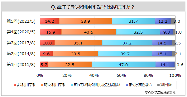 マイボイスコム株式会社(東京都千代田区、代表取締役社長:高井和久)は、5回目となる『新聞の折込チラシ』に関するインターネット調査を2022年5月1日~5日に実施し、10,213件の回答を集めました。調査結果をお知らせします。