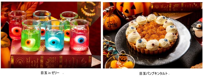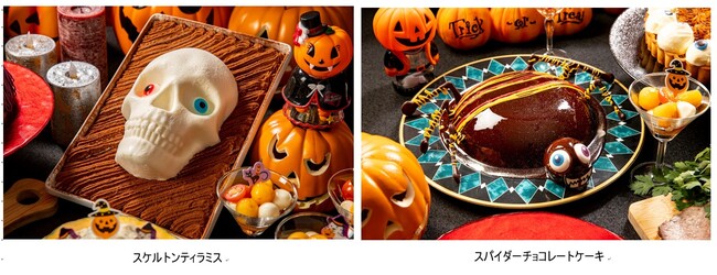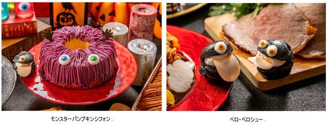 フォトジェニックなハロウィンスイーツ達はシフォンケーキに紫芋のモンブランをデコレーションした「モンスターパンプキンシフォン」やお料理にいたずらを仕掛けるタイミングを狙う「ベロ・ベロシュー」、デスマスクに化けた「スケルトンティラミス」、お料理を鋭い目つきで見つめる「スパイダーチョコレートケーキ」など今にも動き出しそうなスイーツ達を集めました。