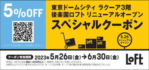 【後楽園ロフト東京ドームシティ ラクーア店にて「リニューアル記念スペシャル5%OFFクーポン」配付】