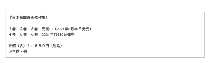 一流の選者陣が選び抜いた珠玉のアンソロジー『日本短編漫画傑作集 少年青年漫画編』が登場します。漫画の歴史を彩ってきた短編漫画。それは時々の世相を映し、技法の変化を示し、時代の欲求を反映します。いしかわじゅん、江口寿史、呉智英、中野晴行、村上知彦、山上たつひこ(五十音順)という豪華選者陣による渾身のセレクト。日本漫画の魅力と豊かさを一挙に賞翫できるまたとない貴重なシリーズ。漫画を愛する全ての人に贈ります。