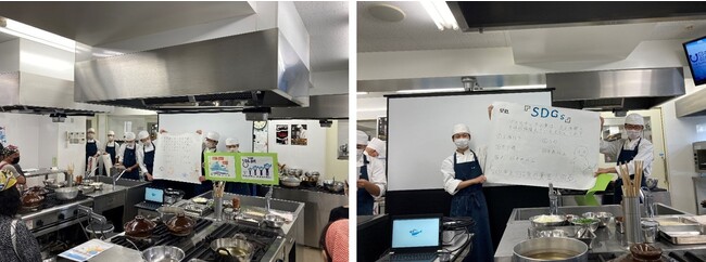 まず、参加の皆さんが海についてどれくらい知っているかをチェックということで河原調理専門学校の学生さんたちが登壇しクイズを出題しました。日本の漁獲量の問題では、2018年の漁獲量はピーク時の3分の1ほどに減少しているという事実や、2050年には海洋プラスチックごみの量が海の魚の重量を超えるという試算に驚きの声が上がりました。