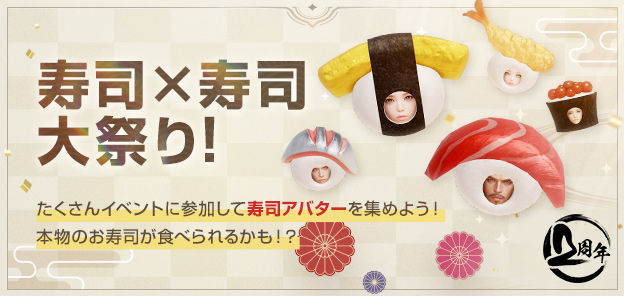 関連イベントで「お寿司アバター」を集めることで、日本国内の「すし券取扱店」となっているお寿司屋さんで使用できる「全国取扱店共通すし券」が抽選で当たるキャンペーンや、もれなくアバターや豪華アイテムが貰えるキャンペーン、初心者&復帰者に役立つイベントなどを開催しておりますので、是非奮ってご参加ください。