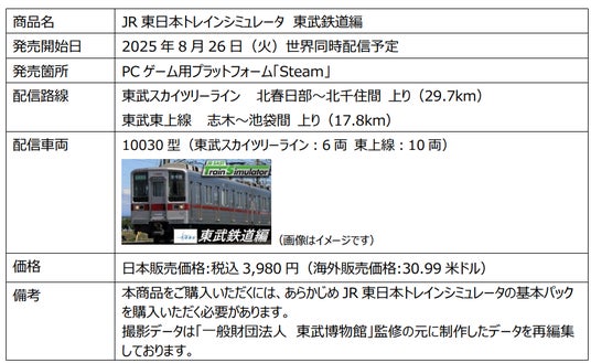 〇東武鉄道株式会社(本社: 東京都墨田区、取締役社長:都筑 豊、以下「東武鉄道」)、東日本旅客鉄道株式会社(本社:東京都渋谷区、代表取締役社長:喜㔟 陽一、以下「JR東日本」)および株式会社音楽館(本社:神奈川県川崎市、代表取締役社長: 向谷 実、以下「音楽館」)の3社は、東武スカイツリーライン(北春日部~北千住間 上り)および東武東上線(志木~池袋間 上り)のトレインシミュレータを配信いたします。