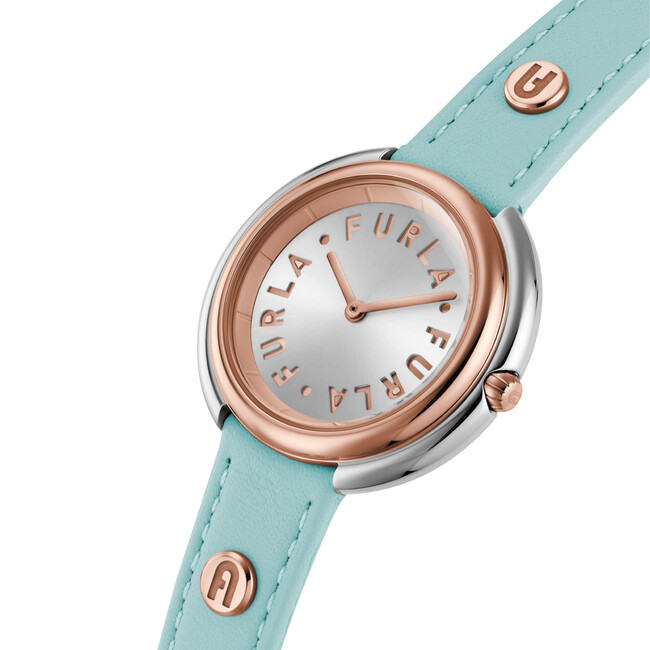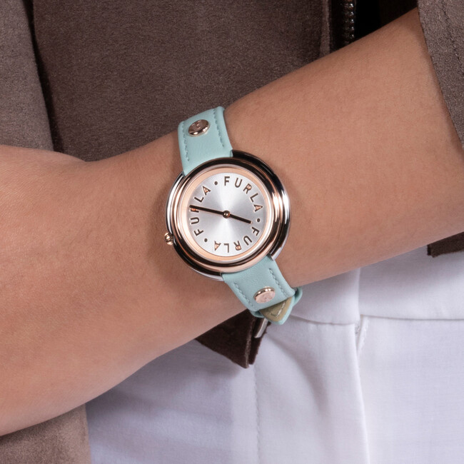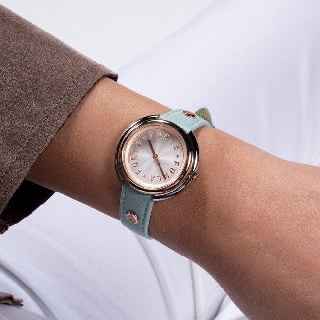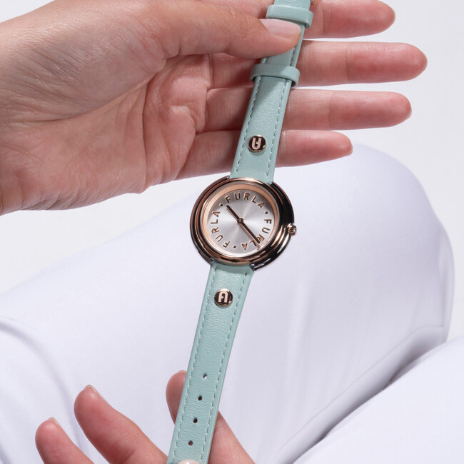 『FURLA ICON SHAPE MINTY(フルラ アイコン シェイプ ミンティー)』は、春夏の装いを爽やかに仕立てる、華やかな最旬腕時計。ミルキーパステル調のミントカラーのベルトと、コンビカラーのケースが華やかな印象を叶え、洗練された手元をつくりだします。