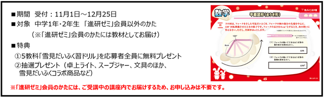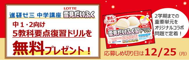 株式会社ベネッセコーポレーション(本社:岡山県岡山市、代表取締役社長:小林 仁、以下:ベネッセ)の提供する 「進研ゼミ中学講座」は、冬休みの学習を応援する「ニガテ解消キャンペーン」の一環として、株式会社ロッテ「雪見だいふく」とコラボレーションした「5教科 雪見だいふく習ドリル」の無料プレゼントを11月1日より12月25日まで実施します。