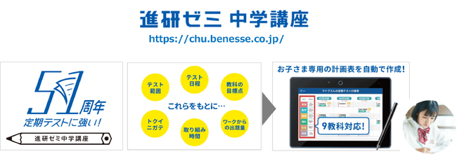 「進研ゼミ中学講座」は、全国の中学生の定期テストの成功を応援いたします。
