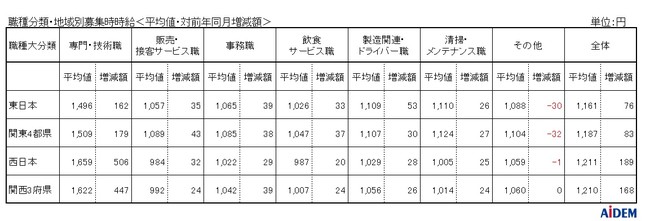 職種大分類別の平均時給は、「専門・技術職」1,509円(前年同月比179円増)、「清掃・メンテナンス職」1,124円(同27円増)、「製造関連・ドライバー職」1,107円(同30円増)、「販売・接客サービス職」1,089円(同43円増)、「事務職」1,085円(同38円増)、「飲食サービス職」1,047円(同37円増)の順で、前年同月比で全ての職種がプラスとなった。都県別の平均時給は、東京都1,204円(前年同月比61円増)、神奈川県1,203円(同77円増)、埼玉県1,162円(同111円増)、千葉県1,147円(同95円増)の順となり、前年同月比で全ての都県がプラスとなった。