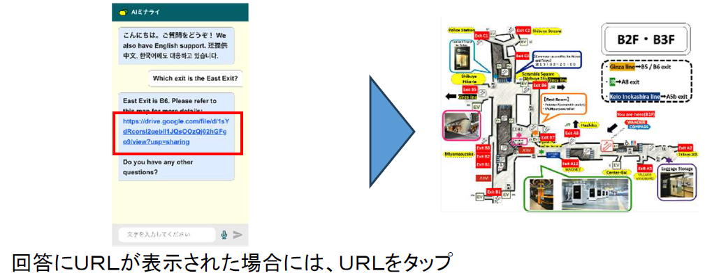 本検証では、観光案内の効率化・案内スキルの平準化を念頭に、Nextremerが提供する対話型AIサービス「AIミナライ」を活用した観光案内サービスを「SHIBU HACHI BOX」、「WANDER COMPASS SHIBUYA」の2か所で提供します。各観光案内所に掲出されるQRコードから、ご自身の携帯端末でAIチャットボットへアクセスし質問をご入力いただくと、AIがご質問に回答、ご質問内容に応じてマップなどもご提供します。