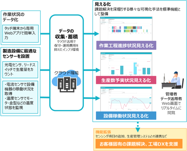 「課題解決特化型IoTサービス」は、製造現場の作業実績入力データや各種センサデータを収集・蓄積し、作業工程や生産実績、設備稼働状況を可視化するサービスです。お客様のニーズに合わせた機能拡張も可能なため、IoTのファーストステップから固有の課題解決まで、工場DXを支援します。