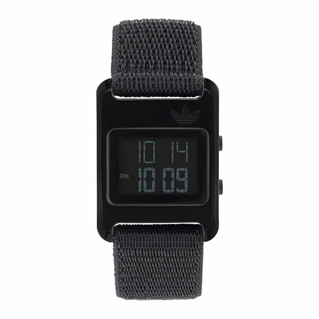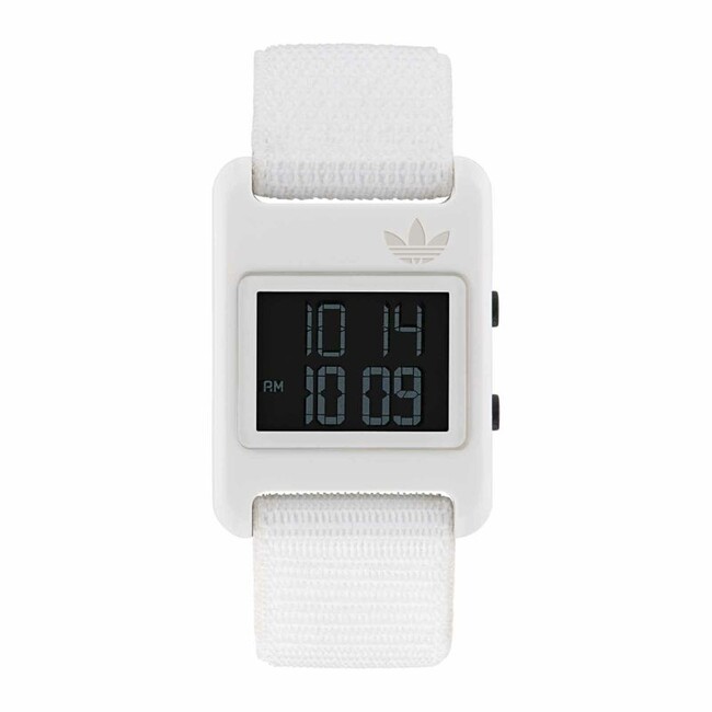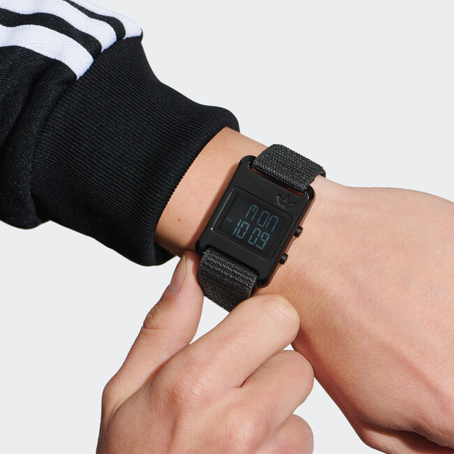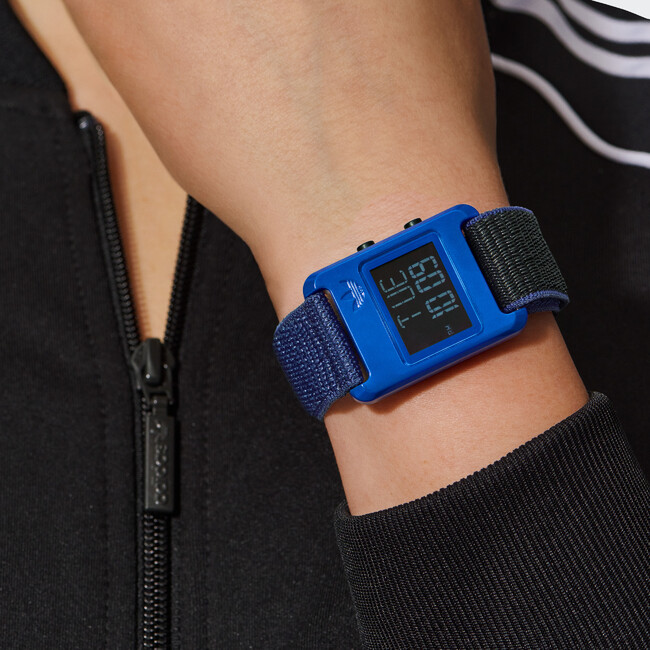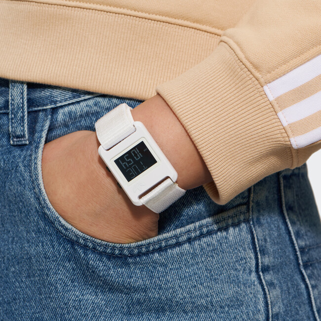 独創的なスクエアフォルムで注目されたレトロポップのデジタル仕様が登場。反転液晶と相まってよりレトロフューチャー感のあるデザインでありながら、様々なファッションに合うシンプルさも併せ持ちます。ケース右上に『adidas Originals(アディダス オリジナルス)』ロゴである”トレフォイルロゴ”を配置しています。ストラップはファブリックバンドを使用し、腕に程よくフィットします。