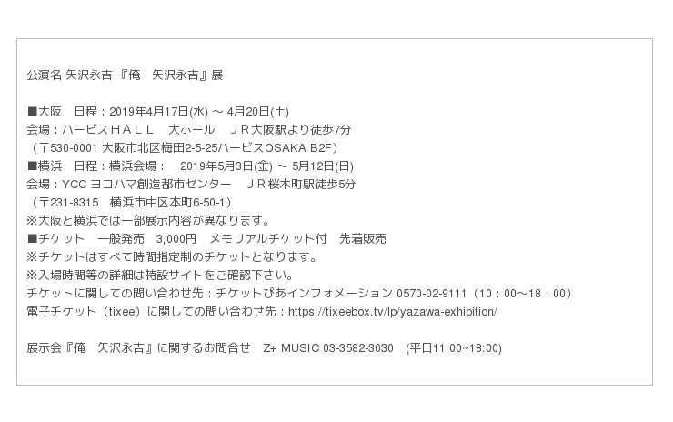 今週4月17日(水)、大阪・ハービスHALL 大ホールにて、矢沢永吉キャリア初となる展示会『俺 矢沢永吉』がスタート。好評につき、急遽、明日の最終日4月19日(土)に、チケットを追加販売することが決定いたしました。