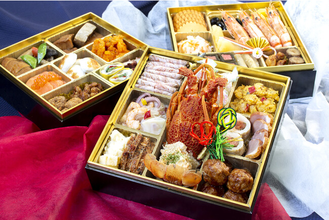 濃厚ホワイトソースで仕上げた“ロブスターのホワイトソース和え”をはじめ、A5ランクの宮崎牛を使用した“特製ローストビーフ”や“宮崎県産黒瀬ぶりの照り焼き”など、選び抜いた厳選素材を生かしたこだわりのおせちをお届けいたします。ご家族や恋人、大切な方々と過ごす新年のはじまりを、当ホテルの華やかな三段重おせちでお楽しみいただけます。