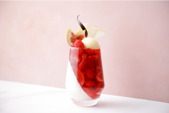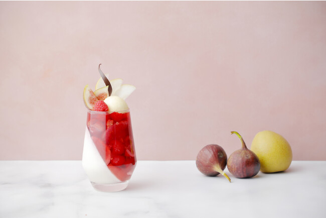 秋に旬を迎える無花果と梨、アドベリーとラズベリーを合わせたパフェ。さっぱりとしたレモン風味のパンナコッタとアドベリーのソースを合わせて、旬ならではの瑞々しさを味わえるフレッシュフルーツをご堪能ください。ティータイムのご利用はもちろん、ディナー後の〆パフェとしてもおすすめの品です。