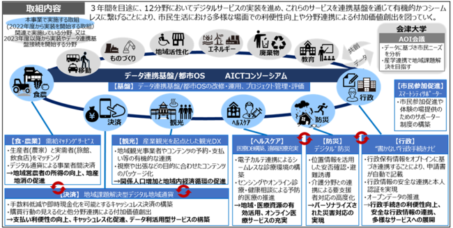 会津若松市では、10 年以上にわたり、市民が自らの意思で共有する(オプトイン)データを活用し、市民一人ひとりのニーズに寄り添った、データ駆動型スマートシティに向けた取り組みを実施してきました。本事業は、これまで実施してきた複数の実証事業を踏まえ、データ連携基盤である都市OSを活用して、ヘルスケア、行政、観光、防災、決済、食・農業の6 分野でデータ連携と付加価値の創出につながる市民向けデジタルサービスを実装するものです。内閣府の「デジタル田園都市国家構想推進交付金事業(TYPE3)※2」として2022年6月に採択されています。