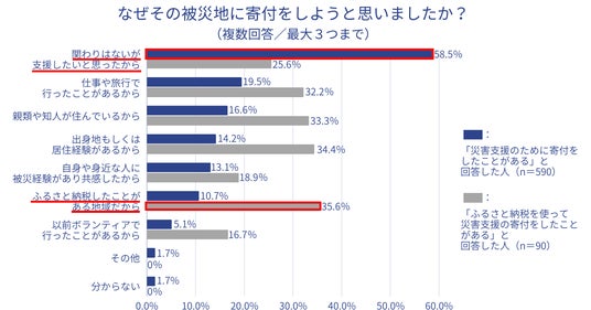 - 被災地に寄付しようと思った理由は、最多が「(特段その地域との)関わりはないが、支援したいと思ったから」(58.5%)。