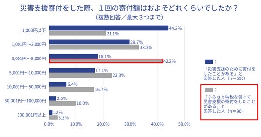 - ふるさと納税での災害支援寄付経験者は、1回当たりの寄付額が比較的高い(「3,001円~5,000円」が最多の42.2%)ことも判明。(回答者全体では「1,000円以下)が最多)