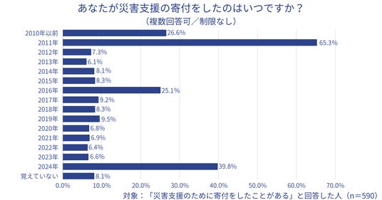 ・災害支援寄付の経験は多い順に、東日本大震災が起きた2011年、熊本地震が起きた2016年、能登半島地震が起きた2024年(今年)