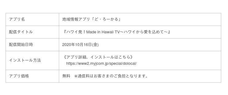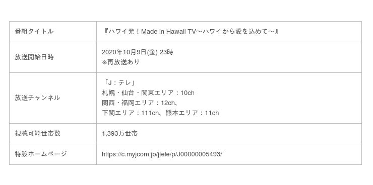 株式会社ジュピターテレコム(J:COM、本社:東京都千代田区、代表取締役社長:石川 雄三)は、ハワイ州知事承認番組の『ハワイ発!Made in Hawaii TV~ハワイから愛を込めて~』を全国1,393万世帯で視聴可能なJ:COMのコミュニティチャンネル「J:テレ」で、2020年10月9日(金)から放送を開始します。日本国内でのテレビ放送はJ:COMが初となります。またJ:COMが提供する地域情報アプリ「ど・ろーかる」でも配信を行いますのでスマートフォンやタブレットで全国どこでもご視聴いただけます。