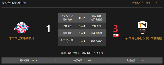 2023-11-13 一般社団法人Tリーグ ノジマTリーグ 2023-2024シーズン 公式戦 11月12日開催 木下アビエル神奈川vsトップおとめピンポンズ名古屋試合結果 Tweet 木下アビエル神奈川とトップおとめピンポンズ名古屋の試合は、3-1でトップおとめピンポンズ名古屋が勝利しました。 企業プレスリリース詳細へ PR TIMESトップへ 公式ツイッター Follow @Straightpress 最新情報をTwitterで受け取ろう! 公式フェイスブックページ 最新情報をFacebookで受け取ろう! 前の記事 一覧へ戻る 次の記事