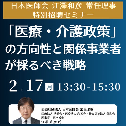 JPI(日本計画研究所)は、公益社団法人 日本医師会 常任理事 江澤 和彦 氏を招聘し、2040年を見据えた「医療・介護政策」の方向性と関係事業者が採るべき戦略について詳説いただくセミナーを開催します。