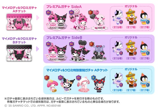 プレミアムガチャに、「マイメロディ&クロミ」「マイメロディ(50周年)」「マイスウィートピアノ」「クロミ(20周年)」「バク」などが限定なかまとして登場します。このプレミアムガチャは、ゲーム内の各種イベントの報酬としてもらえる「マイメロディ&クロミガチャチケット」でも引くことができます。獲得条件などの詳細はゲーム内のお知らせをご確認ください。