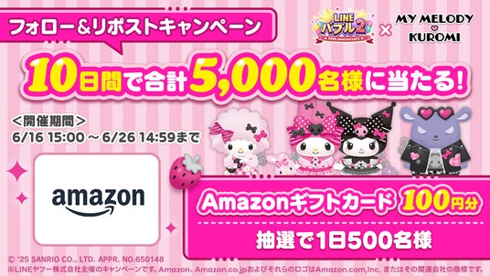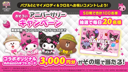 「LINE バブル2」と『マイメロディ&クロミ』のアニバーサリーイヤー(「LINE バブル2」 10周年、マイメロディ50周年、クロミ20周年)を記念してキャンペーンを実施します。参加条件を満たすと抽選で毎日20名(5日合計100名)にコラボオリジナルデザインのAmazonギフトカード3,000円分(現物)が当たる。バブル2とマイメロディ&クロミにお祝いコメントして、一緒におそろいアニバーサリーをお祝いします。