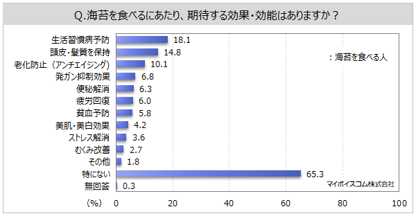 海苔を食べる人のうち、海苔に期待する効果・効能がある人は3割強です。期待する効果・効能は(複数回答)、「生活習慣病予防」「頭皮・髪質を保持」「老化防止(アンチエイジング)」が各10%台となっています。
