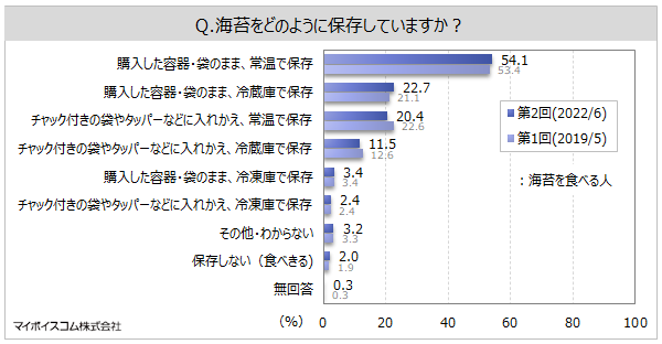 海苔の保存方法は(複数回答)、「購入した容器・袋のまま、常温で保存」が海苔を食べる人の54.1%、「購入した容器・袋のまま、冷蔵庫で保存」が22.7%、「チャック付きの袋やタッパーなどに入れかえ、常温で保存」が20.4%です。近畿・中国・四国・九州など西日本では、「購入した容器・袋のまま、常温で保存」が6~7割と東日本より高くなっています。