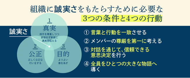 著者による15年の研究と、3200件以上のインタビューから導き出されたのが、本書で紹介する「誠実さ」を構成する3つの条件と4つの行動です。